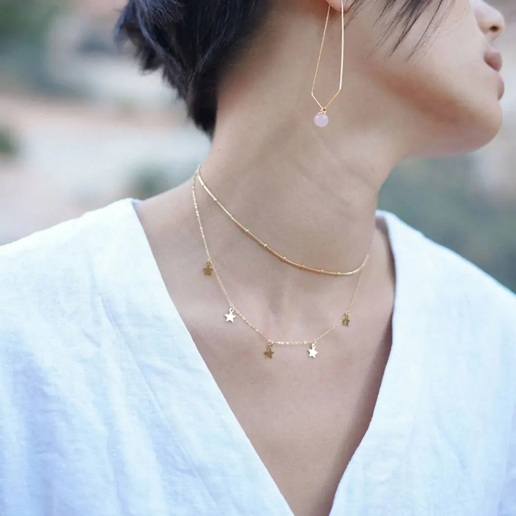 Five tiny gold stars make up a lovely constellation of light. This necklace is 16in 14k gold over brass. Designed and assembled in Sonoma, CA.